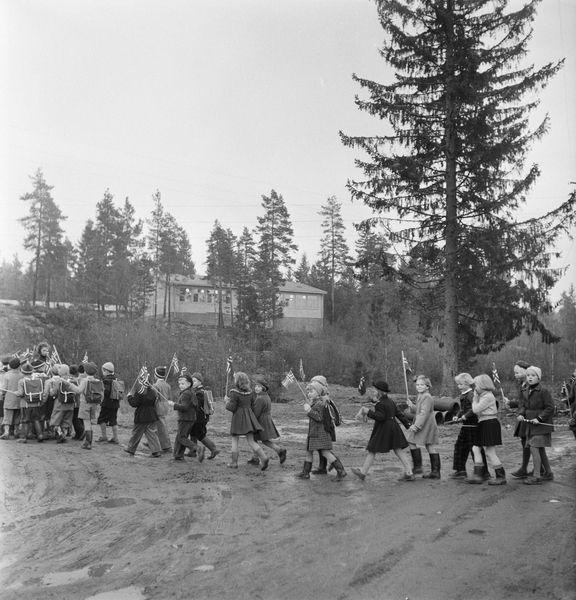Under ser vi elever ved Prinsdal skole under opptoget til innvielsen av skolen i 1953.